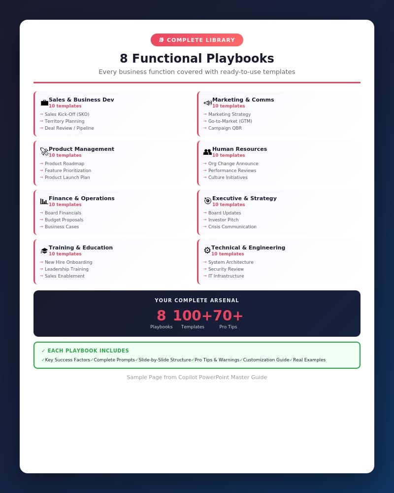 2. 8 Role-Specific Playbooks — 100+ prompts for Sales, Marketing, Finance, Product, HR, Executive, Training, and Technical teams